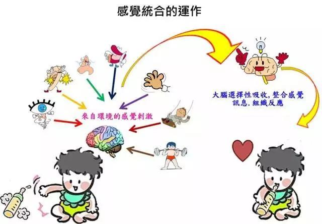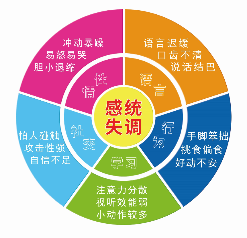 ? 感統(tǒng)對(duì)兒童的影響 知道了感統(tǒng)失調(diào)的原因,那感覺統(tǒng)合失調(diào)對(duì)兒童有怎樣的影響呢?下面我們用一副圖簡(jiǎn)單了解一下吧。 我們?cè)趺粗篮⒆邮欠裼斜匾邮芟嚓P(guān)專業(yè)人員的評(píng)估,以明確孩子是否存在感統(tǒng)失調(diào)呢? 這里有三個(gè)尋求專業(yè)醫(yī)生幫助的正常理由: 1.如果孩子在某些“很自然的行為”方面做的很吃力,需要考慮尋求幫助。 行為問題包括:在地上爬、跑步、跳躍、攀爬、講話、聆聽、擁抱和玩耍行為吃力,那就表示孩子是需要進(jìn)行感統(tǒng)方面的診斷了;如果他們是很自卑的,那答案也是肯定的,自卑是感統(tǒng)失調(diào)的明顯信號(hào)。 2.孩子的問題若對(duì)其他人造成了干擾,也需要考慮尋求專業(yè)幫助。 這些孩子在推倒別人時(shí),會(huì)讓別人很煩;焦躁不安時(shí)會(huì)令老師很生氣,行為莽撞時(shí)會(huì)令父母擔(dān)心,但他們不知道自己為何總讓人不開心。如果孩子在家里(安全的場(chǎng)所)時(shí)天使,到了街上(無法預(yù)期且令人害怕的場(chǎng)所)卻變成魔鬼;在學(xué)校時(shí)天使(懂得自制),回到家里卻變成惡魔(一整天下來把他們累壞了);如果他們換了一個(gè)場(chǎng)合就好像變了個(gè)人似的,這也可能表示他們?cè)诎l(fā)送求救信號(hào)。 ? 什么是感覺統(tǒng)合 感覺統(tǒng)合簡(jiǎn)稱感統(tǒng),是機(jī)體將各種感覺通路的信息輸入大腦,經(jīng)過大腦對(duì)輸入信息進(jìn)行加工、處理、解釋、比較、增強(qiáng)、抑制、聯(lián)系、統(tǒng)一,神經(jīng)系統(tǒng)的不同部分才能協(xié)調(diào)整體工作,使個(gè)體與環(huán)境順利接觸,并作出適應(yīng)性反應(yīng)的能力.感統(tǒng)包括視覺、聽覺、味覺、嗅覺、觸覺、前庭覺和本體覺。感統(tǒng)是人類智慧的基礎(chǔ),是孩子一切能力發(fā)展的根本。 對(duì)于那些感統(tǒng)失調(diào)極為嚴(yán)重的孩子來說,接受治療時(shí)相當(dāng)重要的。對(duì)孩子進(jìn)行感統(tǒng)治療,可以幫助孩子加工處理自己的各種感覺,讓孩子的神經(jīng)系統(tǒng)更好地完善;可以提供孩子必備的生活能力,也能為孩子的未來奠定堅(jiān)實(shí)穩(wěn)定的基礎(chǔ),才能勇敢地面對(duì)未來人生中的各種挑戰(zhàn);可以幫助孩子順利地發(fā)展社交能力;可以讓孩子學(xué)習(xí)更有效率;還能夠改善孩子的情緒狀況和與家人之間的關(guān)系。