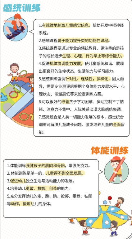 1 感統(tǒng)訓(xùn)練與體能訓(xùn)練 感統(tǒng)訓(xùn)練是從大腦神經(jīng)科學(xué)的基礎(chǔ)入手,借助各種肢體動(dòng)作,豐富孩子各感官系統(tǒng)的感覺經(jīng)驗(yàn),從而滿足孩子成長過程中所需要的感覺輸入,促進(jìn)大腦神經(jīng)的多向連接。 而一般的體適能訓(xùn)練,更注重提高孩子基本的身體素質(zhì)。比如身體的力量、耐力、速度、靈敏度、平衡性和柔韌性等。 2 感覺統(tǒng)合是學(xué)習(xí)的根本 人類通過視、聽、觸、味、嗅五種感官及本體覺獲取信息,經(jīng)前庭神經(jīng)系統(tǒng)過濾后傳至大腦各功能區(qū)域,經(jīng)過整合、分析的結(jié)果,通過大腦額葉區(qū)發(fā)出具體思想、語言、行為的過程,稱為感覺統(tǒng)合能力,又簡稱為感統(tǒng)。 簡單地說,感覺統(tǒng)合是一種大腦和身體相互協(xié)調(diào)的學(xué)習(xí)過程,沒有感覺統(tǒng)合,大腦和身體都不能發(fā)展。 所以可以說:感覺統(tǒng)合是人類智慧的基礎(chǔ),是一切能力發(fā)展的根本。 3 兒童感覺綜合能力發(fā)展周期 感統(tǒng)訓(xùn)練貫穿孩子整個(gè)2-10歲,不同年齡孩子的能力發(fā)展不同,因此對(duì)應(yīng)的訓(xùn)練方式也不同。 感統(tǒng)失調(diào)不是病,而是每個(gè)人都有的一種行為障礙,從小給孩子進(jìn)行調(diào)整,幫助孩子建立正確的自我評(píng)價(jià),讓他更自信地學(xué)習(xí)與生活。